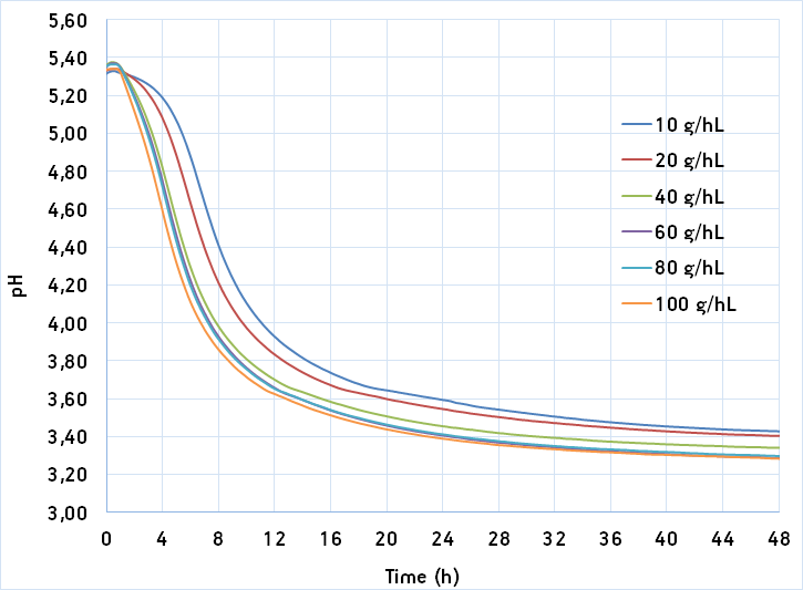 Stejně jako mnoho produktů Fermentis má SafSour™ LP 652 certifikaci E2U™, což znamená, že bakterie můžete namíchat přímo do nechmelené mladiny bez jakéhokoli předchozího kroku rehydratace. Zjednoduší vám to práci a zaručí vám stejné výsledky, pokud jde o dobu okyselení a organoleptický profil [ve srovnání s předchozí rehydratací]. Všimněte si, že je nezbytné postupovat s nechmelenou mladinou, protože Iso-alfa kyseliny přítomné v chmelu by inhibovaly růst bakterií a jejich metabolismus, pokud byste je po přidání chmele nalili. Fermentis doporučuje namíchat 10 g/hl bakterií do chlazené 12 Mladina °P v teplotním rozsahu 30 až 40 °C [86 – 104 °F]. Konečné pH dosažené za těchto podmínek bude mezi 3,2 a 3,6. Níže uvedený graf ukazuje, že při vyšší rychlosti kvašení bude mléčné kvašení probíhat rychleji a dosáhne nižšího konečného pH.